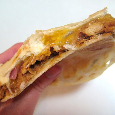 - Cook over medium heat until under side is browned and crisp and cheese is melted. Top half the tortilla with warmed bbq chicken and fold tortilla in half, then cut in half so you have two triangles. Enjoy.