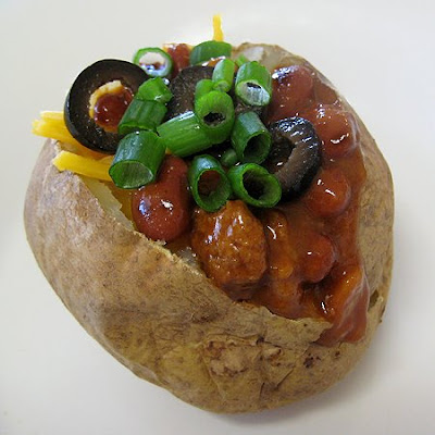 With the baked potato also comes the sweet potato. There are some really fun ideas to top those too. Hopefully, I give you some inspiration and have you looking differently at the baked potato or sweet potato. The one have have for my picture was topped with traditional cheese and chili, but then I added olives and green onion. I forgot to add the sour cream for the picture, but we used that too.