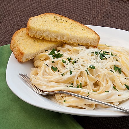 My favorite thing to order at Olive Garden in Fettuccine Alfredo. Pasta, cream and cheese – 3 simple ingredients that make a deliciously creamy and comforting dish. Sometimes, the simple dishes are what are the best. I do, however, only allow myself to have it occasionally since it is so high in calories. When a saw a version over at Cooking Classy claiming to be better than Olive Garden fettuccine alfredo, I had to give it a try.