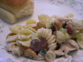- In large bowl, add pasta, chicken, pineapple, grapes, celery, onion, and craisins.