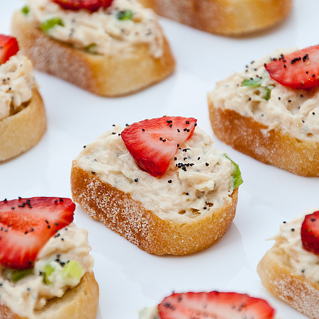 - Spread a spoonful of the chicken mixture on top of each baguette slice followed by a strawberry slice or two and a sprinkle of poppy seeds for garnish.