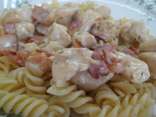 Update: I have also make this with leftover cooked chicken. I just skip the part to cook the chicken and make the sauce using the bacon drippings and sprinkle it with flour and salad dressing mix.