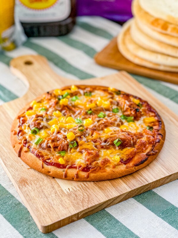 I was recently inspired by another blogger to create a recipe for an easy BBQ pulled pork pita pizza, and I’m so glad I did. It turned out to be the perfect way to use up leftover pork from the loaded BBQ pulled pork and potato bowls I shared last week. I love finding simple ways to repurpose leftovers into something that feels completely new. These personal pizzas are topped with homemade slow cooker pulled pork (though store-bought works great if you need a shortcut), Sweet Baby Ray’s BBQ sauce, plenty of shredded cheese, sweet corn, and a sprinkle of green onion for a bright finish.