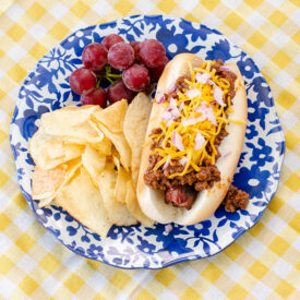 If I’m not have my hot dog the basic way I like it, with ketchup and relish, then I like to have it with chili and cheese. Now you can go the easy route and open up and can and chili and heat it up. Or you can grab a pound of ground beef. Then you can make up a batch of this easy chili for hot dogs.