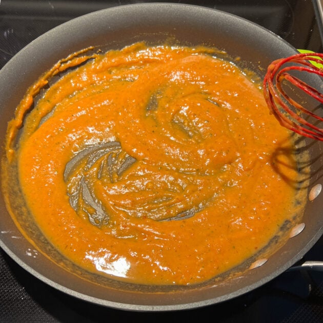 - In a large skillet, melt the butter. Whisk in the flour and cook for 2 more minutes. Add the garlic, tomato paste, onion powder, basil, oregano, and mustard powder. Stir to combine.