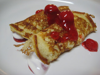 I think my sister-in-law made this for a family reunion. I wanted the recipe and come to find out, I already had it in a Quick Cooking magazine I had sitting at my house. You can use whatever pie filling you like or use fresh berries and make your own with sugar and cornstarch. Adjust the amount for as many pancakes as you need.