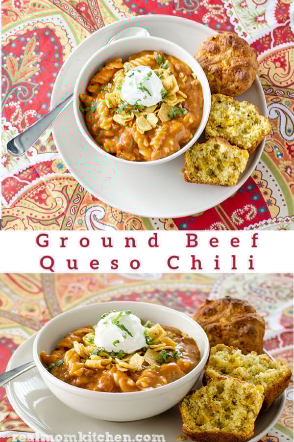 You will love how hearty this ground beef queso chili is. It’s like a regular chili with pasta and homemade queso sauce mixed in to it.