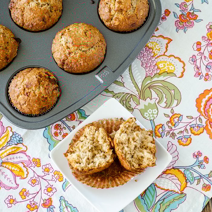 After these come out of the oven, the brown sugar helps make a slightly crunch top. The texture that the oatmeal adds to the muffin is wonderful. My husband, however, had a different opinion on the texture. He said the muffins were too chewy for him. Next time, I think I may use half quick oats and half old fashioned oats and see if that helps with the chewiness of these muffins for him.