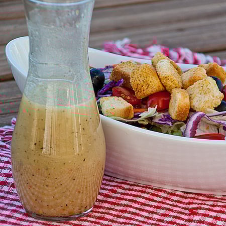However, right after trying this recipe I had heard that Sam’s Club was now an exclusive carrier of Olive Garden’s dressing now available in a bottle.  I went the next day to buy it.  It was right around $7 for 2 bottles that are each 20 oz.  So you can make this version of Olive Garden salad dressing at home or get it in a bottle from Sam’s Club.  Either way it is so delicious.  Just remember to get the lettuce, tomatoes, red onion, olives, croutons, and banana peppers (I skip these) to make your own at home version of Olive Garden’s Salad.  Oh, and the Parmesan too, if you like that on there also!