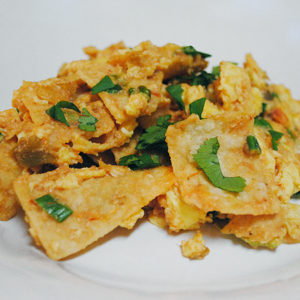- Pour the salsa on the eggs and gently fold in (be careful not to over stir, you’ll end up with pellet like scrambled eggs). Add the tortilla strips and gently fold in. The tortilla strips will soften and reduce in volume as they are mixed in so don’t worry if your pan seems to be over flowing at first! Just keep folding gently.