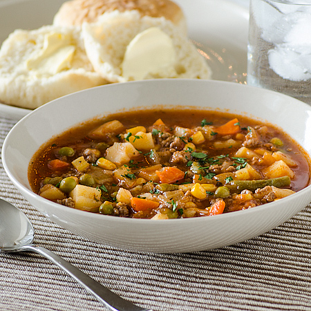 “Souper” Bowl week continues on RMK today with an easy quick vegetable beef soup. Â My hubby usually turn his nose up at any vegetable beef soup out there. Â I was worried when I made this is that he would even give it a try.