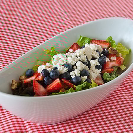 - Place lettuces in a large bowl and combine. Follow by layering the glazed nuts followed by the strawberries, blueberries, and finishing with the feta cheese.