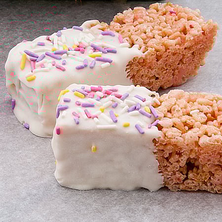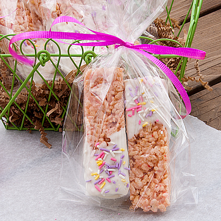 - Lay out a sheet of parchment paper or waxed paper. Dip each krispie treat 1/3 to half way in the melted almond bark. Place on the waxed paper and sprinkle the dipped portion of the treat with Easter sprinkles. Repeat until all treats or dipped and sprinkled. Allow for the almond bark to set and store in a container or package up in cellophane bags.