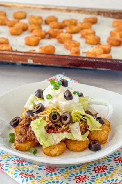 There are all kinds of twists on a good old taco. There are Navajo tacos, flat bread tacos, taco pizza, and taco soup. Well, today I have another twist for you – tater tot tacos – the ingredients of a taco served over tater tots instead of in a tortilla. It’s a playful take on classic tacos that’s perfect for a family dinner. This is a fantastic addition to your menu rotation for a meal that’s both delicious and unique.